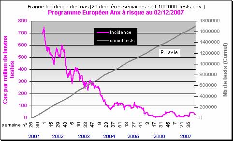 En 2006 et 2007 la barre des 10 cas par million de bovins testés est franchie...